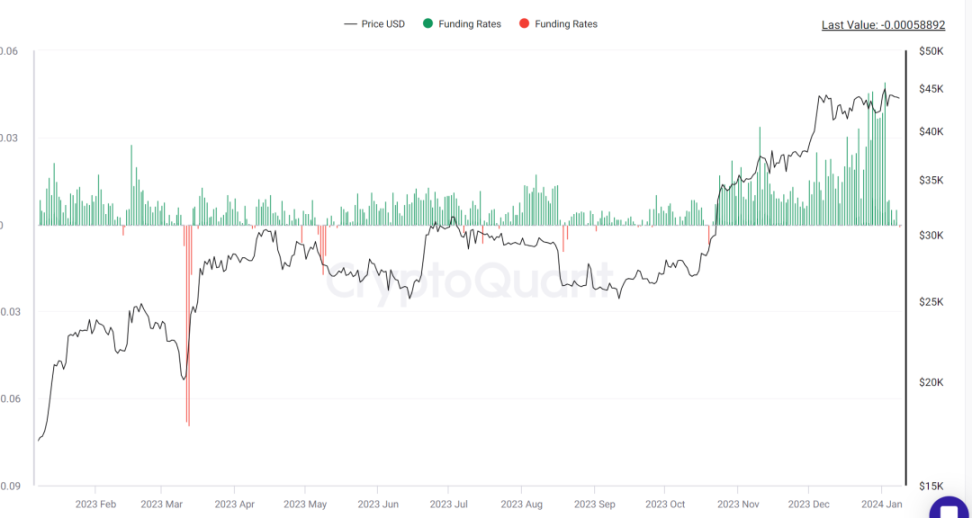比特币在上周仍然处于箱体内的震荡之中,虽然在 1 月 2 日突破箱体上沿来到了 45900 美元,但在第二天证明是假突破,价格回落至箱体下沿的 40900 美元。通过比特币费率图我们可以看到,从 1 月 3 日开始,比特币的资金费率出现了断崖式的下跌,回到了十月中旬的水平,要比突破 45000 美元时的资金费率低很多,资金费率的高低可以作为市场情绪判断的指标之一,正值就表明看多的人更多,负值表明看空的人更多。