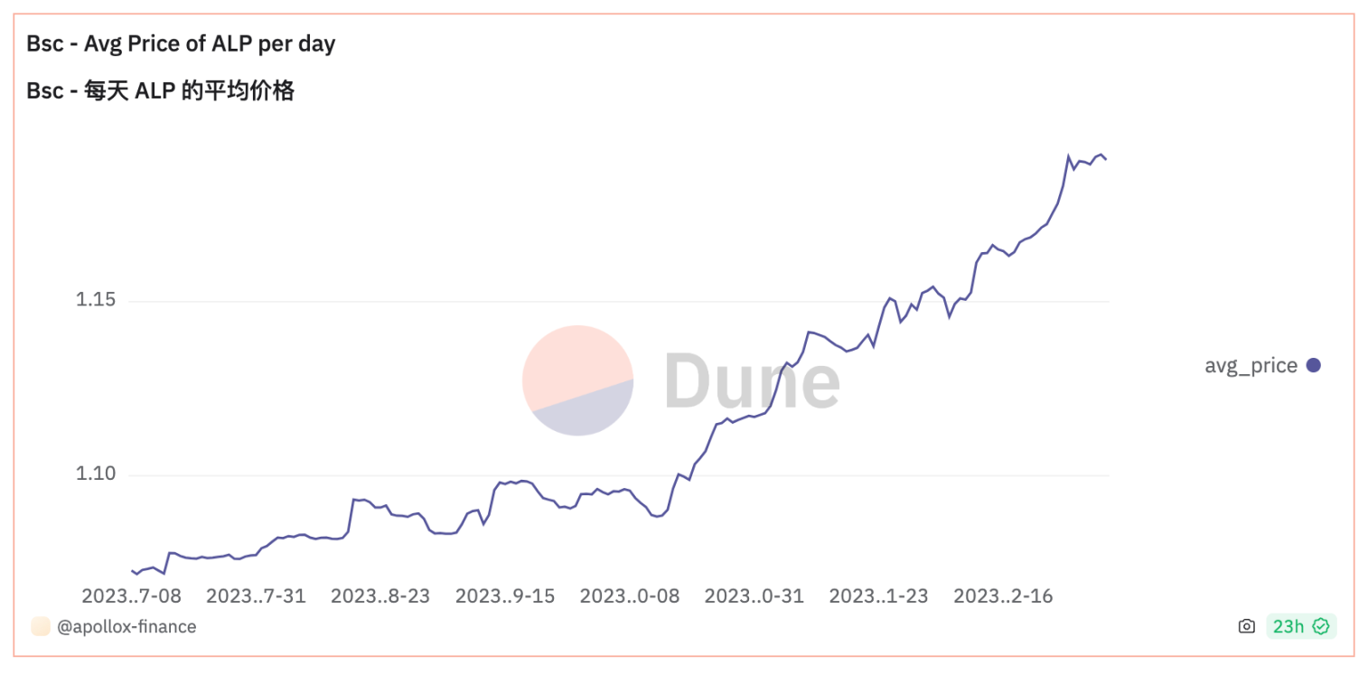 同时,ALP 的价格也一直在稳步上涨。其上涨动力来源于 Trader 的亏损。据 Dune 数据显示,目前 Trader 已经亏损了 1.48M USD,这部分也将归为 ALP 的收益。
