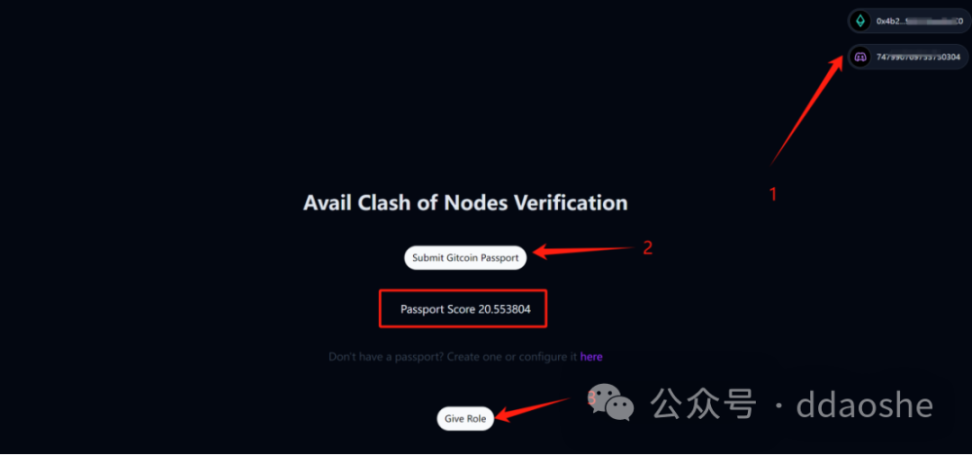 https://passport-verifier.avail.tools/链接小狐狸和 dc 账号进行验证,要求 gitcoin passport >20 分,然后点击 get role 即可开启领取测试水的频道
