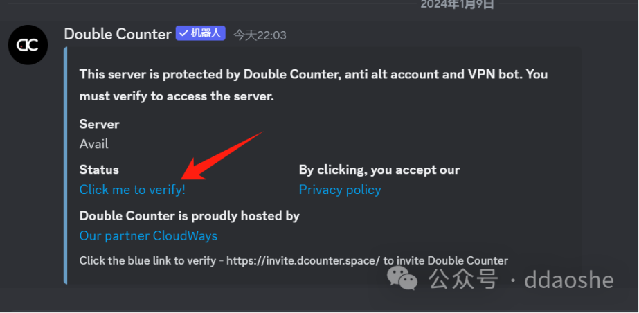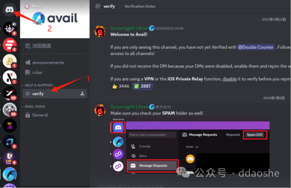 https://discord.gg/availproject(如果失效的话,可以通过官网中的 dc 链接加入),dc 账号需设置为允许陌生人发私信,然后去私信中找到 Double Counter 的验证私信