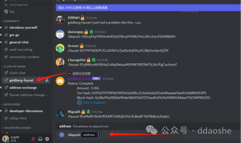 6 前往 dc 的 goldberg-faucet 频道使用 /deposit+ 地址的格式领取测试水