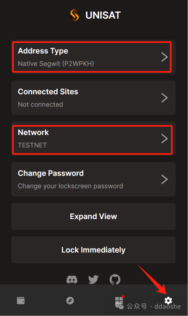 7 进入 unisat 钱包,网络更改为测试网,地址格式选择 Native 格式的,并复制地址