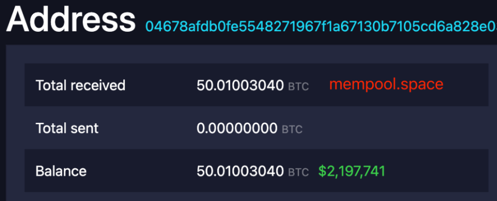 也因此,不像很多工具,把这两者合并,显示总余额为 99.68+ BTC。mempool.space 把两者分开显示,P2PK 地址的余额目前是 50.01003040 BTC,而 P2PKH 地址的余额目前是 49.67316581 BTC。