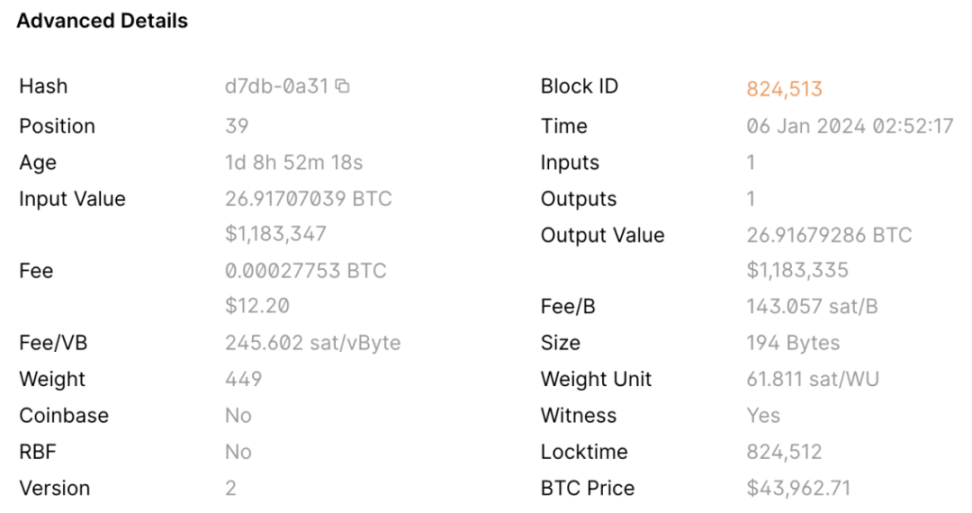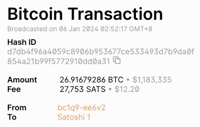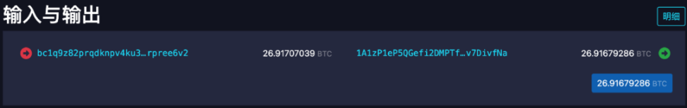 原因是它给中本聪的比特币地址“赞赏”了 26.91679286 BTC。一笔时价折合 100 多万美刀的打赏!