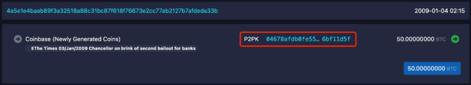 值得注意的是,在中本聪刚刚上线比特币系统的时候,还没有开发 P2PKH 交易类型,因此,严格地讲,中本聪最早构造的 50 个创世 BTC 并不是 P2PKH 即支付到公钥哈希地址 1A1zP1eP5QGefi2DMPTfTL5SLmv7DivfNa,而是 P2PK 即支付到公钥地址 04678afdb0fe5548271967f1a67130b7105cd6a828e03909a67962e0ea1f61deb649f6bc3f4cef38c4f35504e51ec112de5c384df7ba0b8d578a4c702b6bf11d5f 。