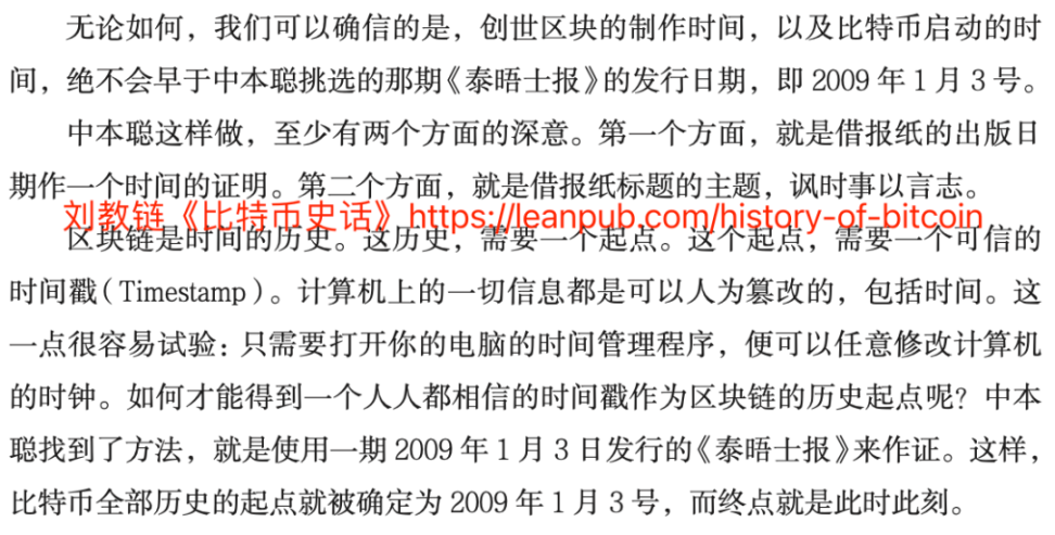 「彼时彼刻,中本聪正踌躇满志,完成比特币最后的设计,以一己之力将其发布。彼时彼刻,中本聪正心怀密码朋克宣言之愿景,向着充满人为操纵、货币超发、 劫贫济富的金融系统吹响了战斗的号角。彼时彼刻,中本聪正冷眼注视着那场由美国次贷大骗局崩盘所造成的全球性金融危机,把《泰晤士报》报道和见证的危机缩影镌刻在了比特币的创世区块中,随比特币的存在而永恒,时刻警示着后人。」