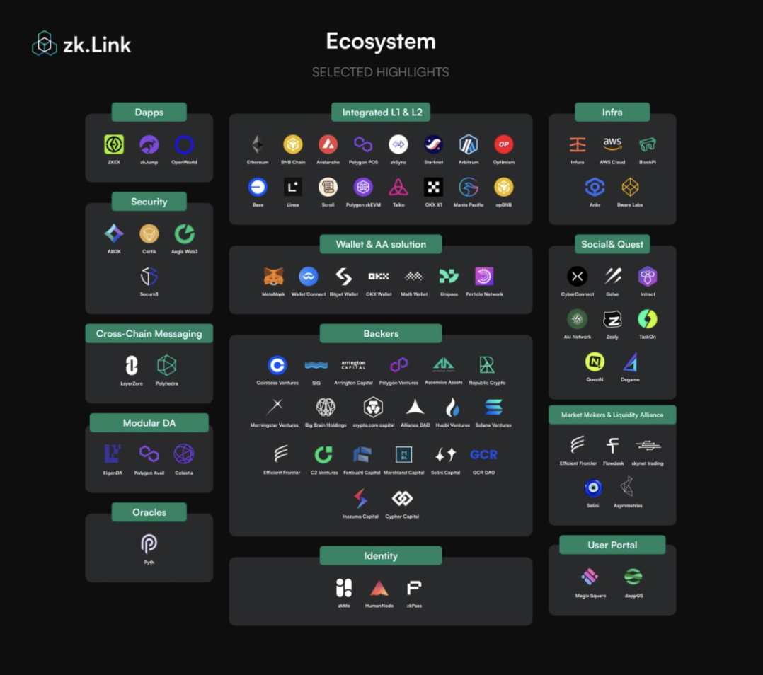 zkLink 是由 Coinbase Ventures, Arrington Capital, DeFi Alliance, Huobi Ventures, Solana Ventures, Polygon Ventures 等知名机构投资的基于 ZK-Rollup 技术的多链中间件,它通过「ZK-Rollup + 预言机网络」的机制,实现了多链功能以及对经典 ZK-Rollup 的扩展。