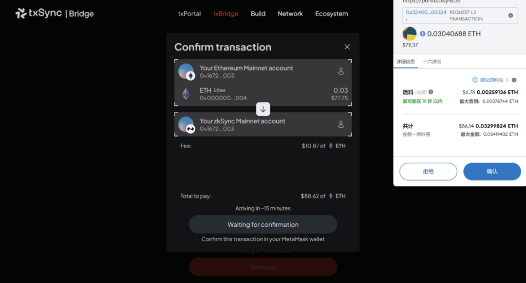 1、跨链:通过 zkSync 官方跨链桥或从交易所提取资金 Eth 到个人钱包,注意提币时一定要选择 zkSync Era 网络