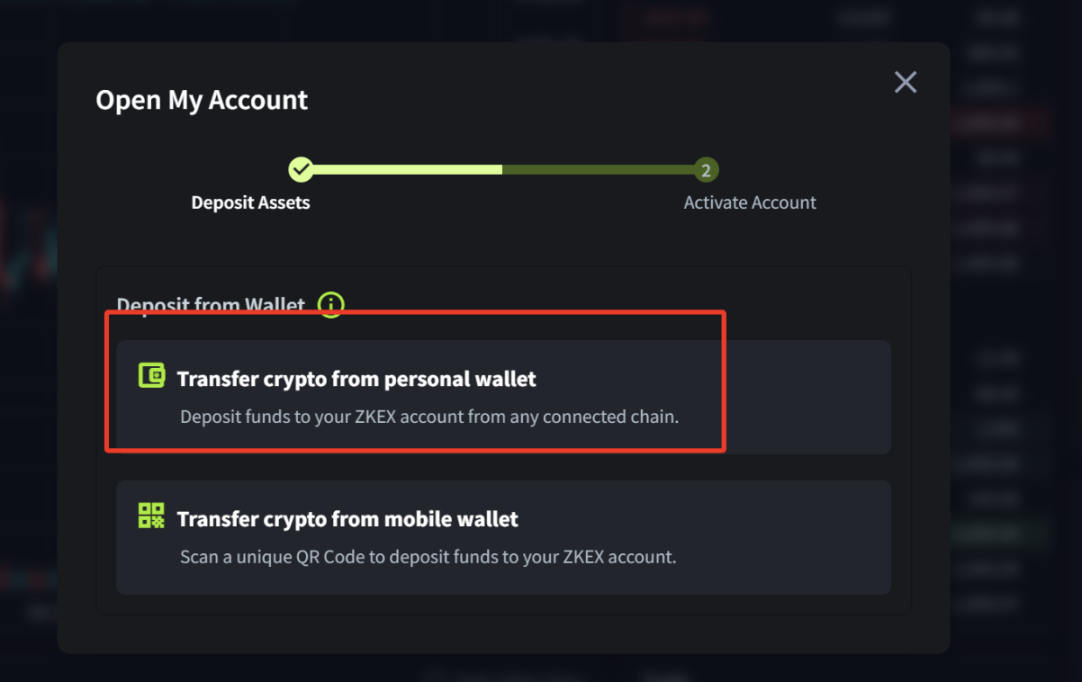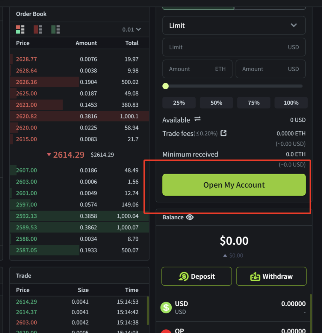 3、充值资金,首次交互点击页面右侧下方 Open My Account,选择从个人钱包充值资金;注意填写充值金额时,预留部分 ETH 作为充值交互手续费;充值完成后点击 Activate 激活账户