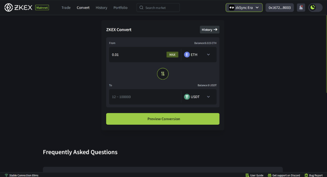 5、使用 Convert 兑换 ETH 和 USDT,注意最低交易金额为 0.01 ETH