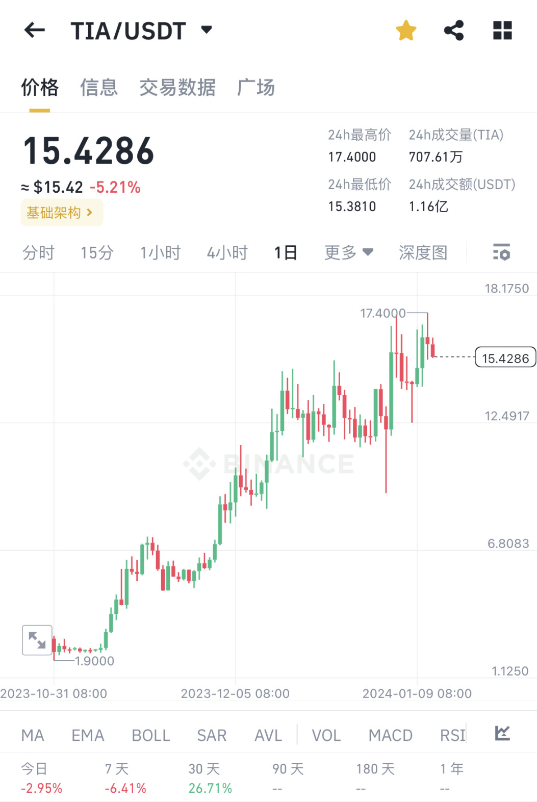 刚上线的 TIA 价格在 2 美元波动了一段时间,我在 5 美元挂单卖了一部分,剩下的部分放在钱包里质押。后来 TIA 一路上涨,当前价格是 15 美元。