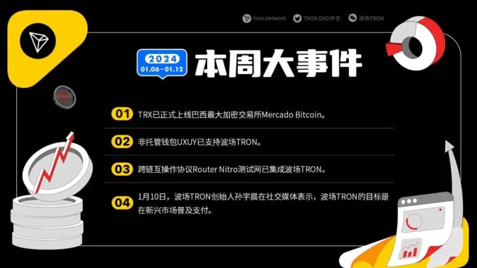 4、1 月 10 日,波场 TRON 创始人孙宇晨在社交媒体表示,波场 TRON 的目标是在新兴市场普及支付。
