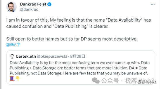 DA 虽然被称作数据可用性,但这个名词实际指的是数据发布,只是因为 Vitalik 和 Mustafa 在最初给这个概念起名字时,没有深思熟虑,才有了 DA/ 数据可用性这种名不符实的叫法。