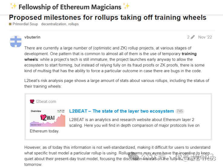 (Vitalik 曾表示,由于 Rollup 方案在早期启动时无法达到理论上的完善度,所以必须借助于一些辅助手段提升安全性,而这些辅助手段被称为「辅助轮」,并会引入信任假设。这些信任假设就是风险)