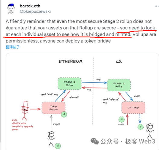 对于以太坊 Layer2 而言,只要 Layer2 官方可以在 Layer1 链上快速升级合约,理论上可以把 L2 官方桥充提款地址上锁定的 Token 盗走,无论其 DA 层或证明系统有多么可靠。
