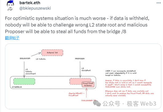 Sequencer/Proposer 可以与 ETH 链下的 DA 层节点串谋,在 Layer1 上更新 stateroot,但扣住状态转换对应的输入参数不发出来,让外人无法判断新的 stateroot 是否正确,成为「睁眼瞎」。
