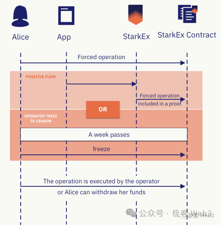 部分以太坊 Layer2,如 Loopring 和 StarkEx、dYdX、Degate 等,会在 Layer1 上设立一个抗审查的强制提款 / 逃生舱激活函数,以 Starknet 为例,如果用户在 Layer1 上提交的 Forced Withdrawal 请求,在 7 天窗口期结束时,未得到 Layer2 排序器响应,则可以手动调用 freeze Request 功能让 L2 进入冻结状态,激活逃生舱模式。