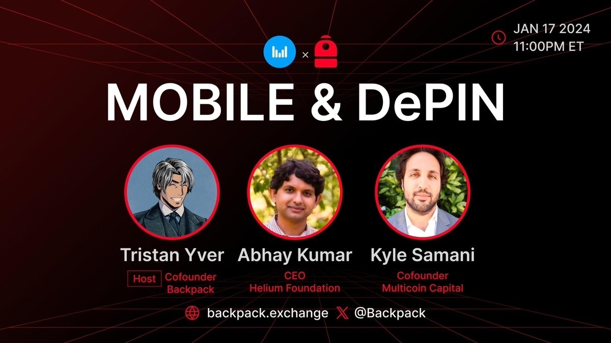 迪拜持牌合规交易所 Backpack 将于香港时间 11 月 17 日早上 11:00 上线热门 DePIN 项目 Helium Mobile $Mobile, Helium 基金会 CEO Abhay Humar 及 Multicoin Capital 联合创始人 Kyle Samani 将参与 Backpack 于香港时间 11 月 18 日上午 12:00 组织的 Twitter Space 分享 Mobile 及 DePIN 相关话题。