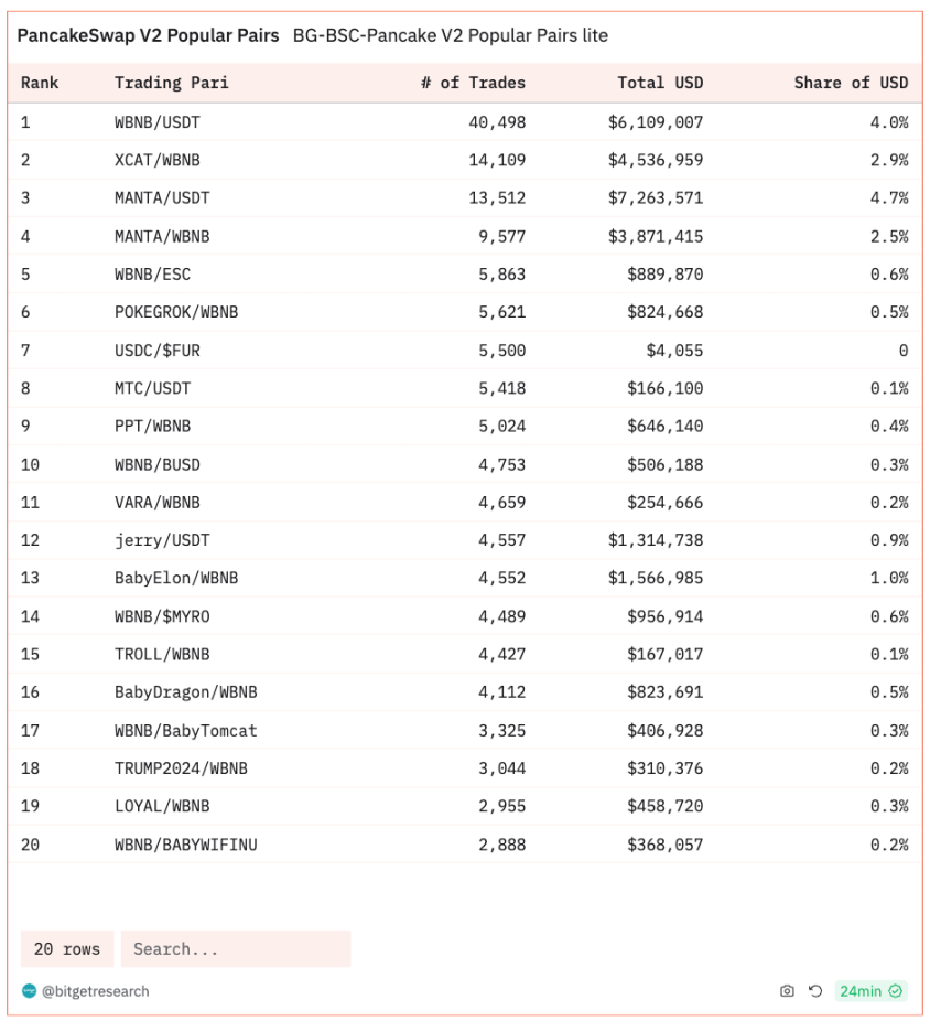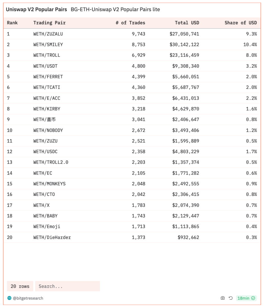 ZUZALU(Token):蹭 V 神一条推文发的 memecoin,3 月 TGE 短时大涨大跌后沉寂,两日前突然 24h 拉盘 40 倍,回调一日后又大涨破新高,和 TROLL 的币价节奏相似。24h Dex 交易量达到 27M 美元,24h 交易笔数达到 9655。