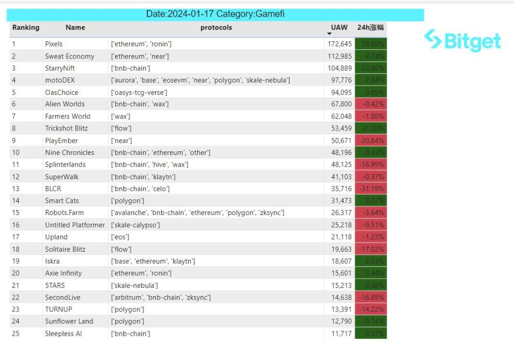 Pixels(Dapp):Pixels 是一个基于区块链的沉浸式开放世界大型多人在线(MMO)游戏,利用 web3 的力量实现玩家的数字所有权,并创造了一个玩家可以探索、完成任务和协作 Pixels 游戏以种植、烹饪和任务为核心机制首次推出,并逐渐添加了交易、成就和排行榜等社交功能,以促进玩家之间的互动。