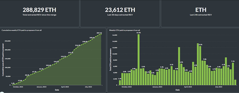 从 MEV 的角度上来说,拿以太坊举例,根据 Flashbots 的数据显示,自以太坊 The Merge 后,其统计的区块提议者(Proposer)已实现了 288829ETH 的 REV 提取。(注:REV 为已经被提取过的 MEV)