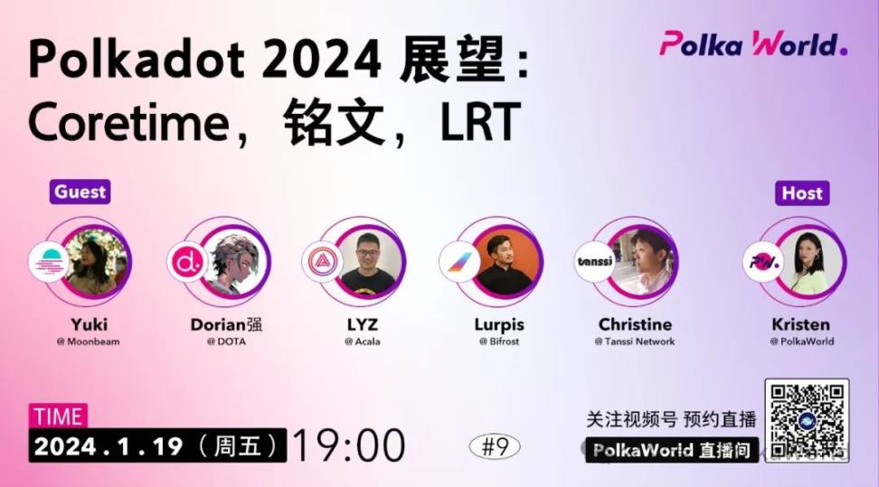 1 月 19 日(今天)晚上 7 点,PolkaWorld 视频号直播间将举办「Polkadot 2024 展望:Coretime,铭文,LRT」直播。来自 Moonbeam、DOTA、Acala、Bifrost、Tanssi 团队的嘉宾将来到直播间与社区互动。