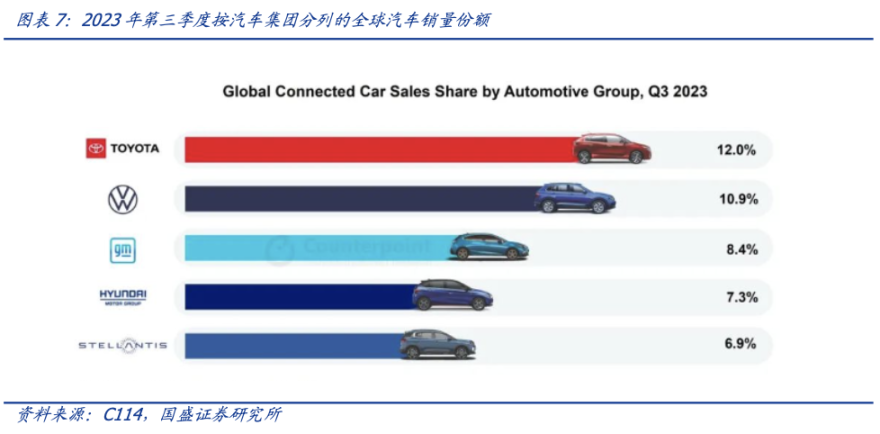 高级分析师 Soumen Mandal 指出:"随着消费者科技意识和互联需求的不断提高,非互联汽车的销量正在稳步下降。2023 年第三季度,前五大汽车集团占联网汽车销量的近 45%。丰田集团以 12% 的销售份额领跑出货量排行榜,大众集团紧随其后。通用汽车集团、现代起亚汽车集团和 Stellantis 是前五名中的其他三家。"