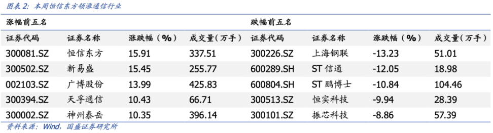 本周受益 MR 概念,恒信东方上涨 15.91%,领涨板块。受益光通信出海逻辑,新易盛上涨 15.45%,受益抖音概念,广博股份上涨 13.99%,受益光通信出海逻辑,天孚通信上涨 10.43%,受益公司游戏业务超预期,神州泰岳上涨 10.35%。