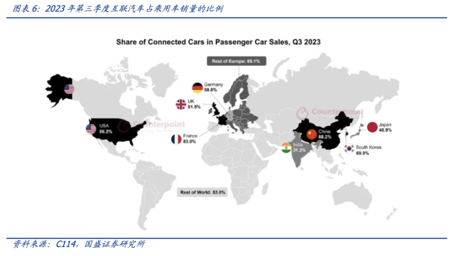 在全球互联汽车销量中,中国以约 33% 的份额遥遥领先,其次是美国和欧洲。这三个地区占第三季度全球联网汽车销量的 75% 以上。
