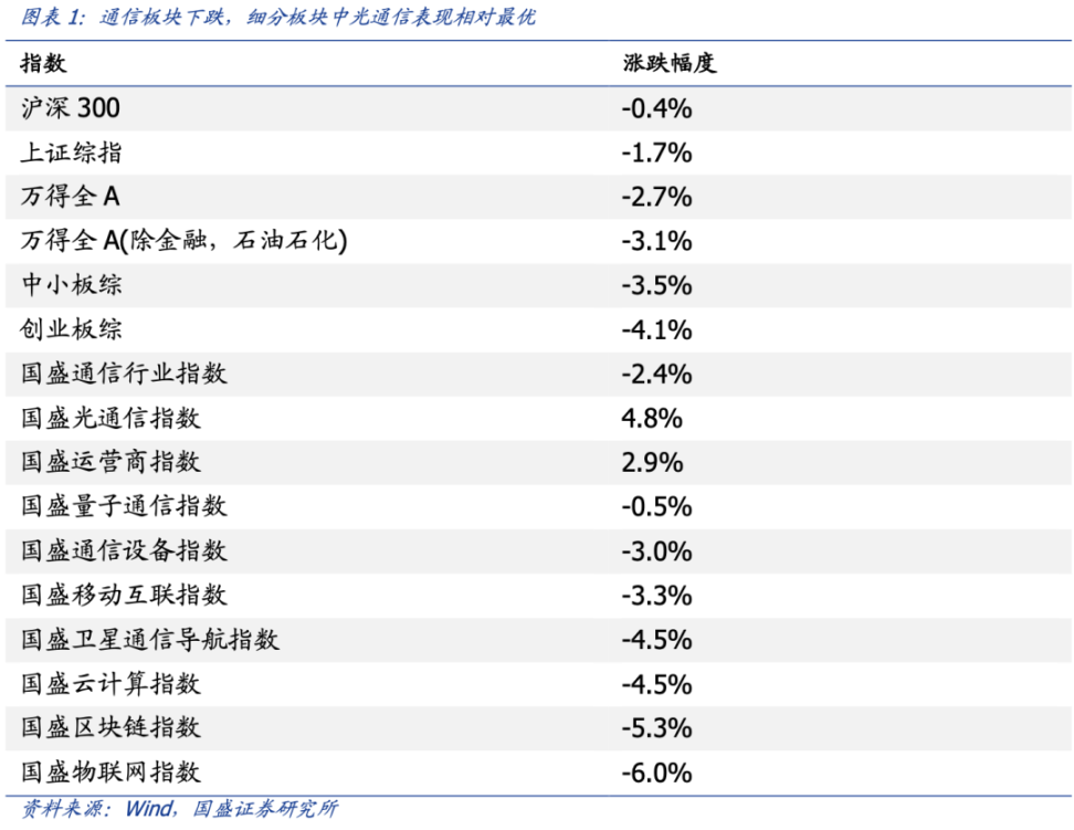 二、行情回顾:通信板块表现下跌,光通信表现最佳