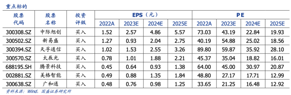 光通信:中际旭创、新易盛、天孚通信、太辰光、腾景科技、光库科技、光迅科技、德科立、联特科技、华工科技、源杰科技、剑桥科技、铭普光磁。