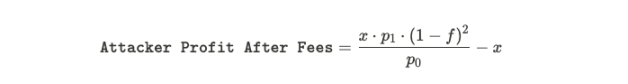 例如,如果铸造和销毁的交易费用是恒定且相等的 f,则一个在 p0 销毁 x 稳定币并在 p1 以 ETH 再出售给协议的攻击者,最终会出现以下利润: