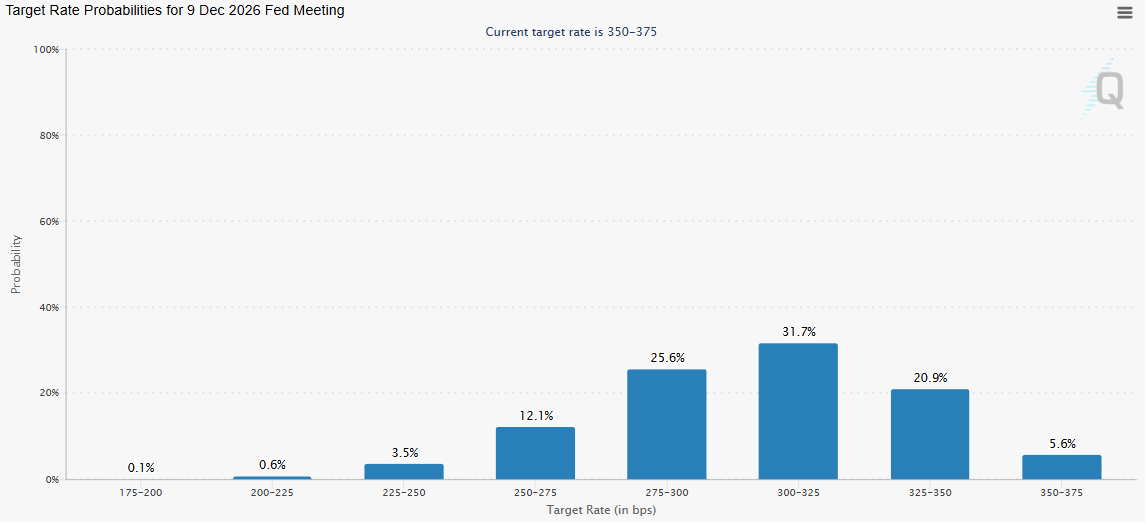 b. 市场预计到 2026 年 1 月,美联储以 82% 的概率将利率维持在 3.50%–3.75%,仅小概率再降息 25bp;