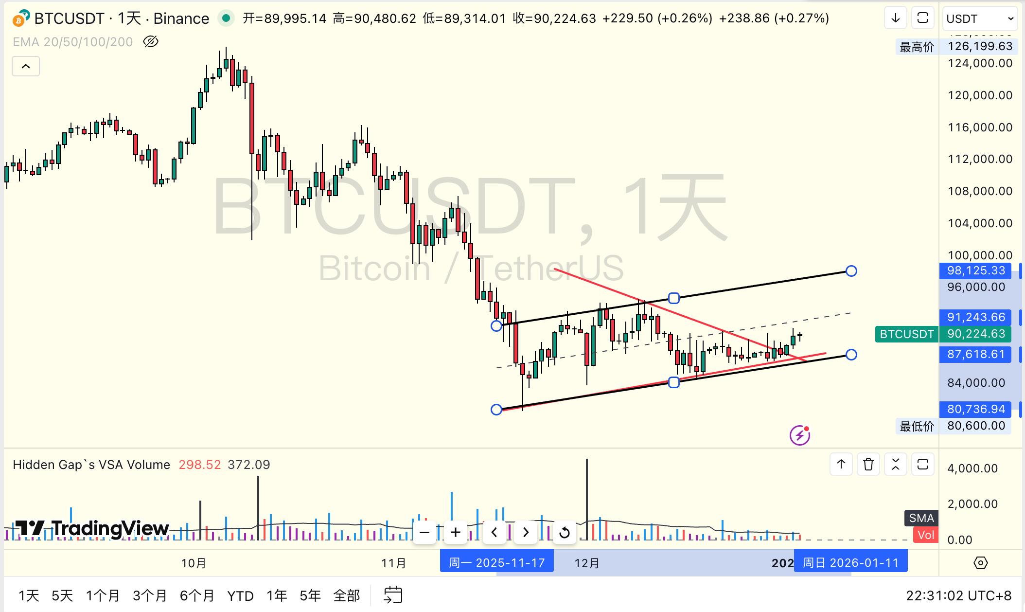 a. 上周对币价判断会在进入一月份后开始向上,但期中可能会出现假突破,实际来看,上周市场在周一及周三连续出现短期突破的现象,在清洗掉部分短期筹码后,市场在周四开启稳步向上并突破三角区间,表现市场正从防御转向机会,本周预计市场会在 9 万附近震荡筑底后继续向上,如果顺利到达通道上轨,可以在上轨(97000 - 98000)附近做波段,因为当前币价被多个均线压制,价格很难一举突破多个均线压制,最好的剧本是每到一个目标位价格能横盘蓄势,消化掉均线压力后再继续向上。