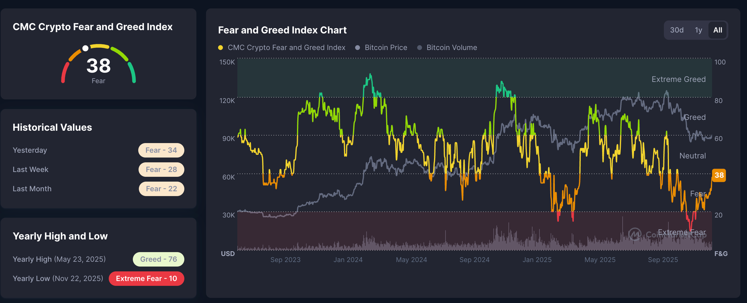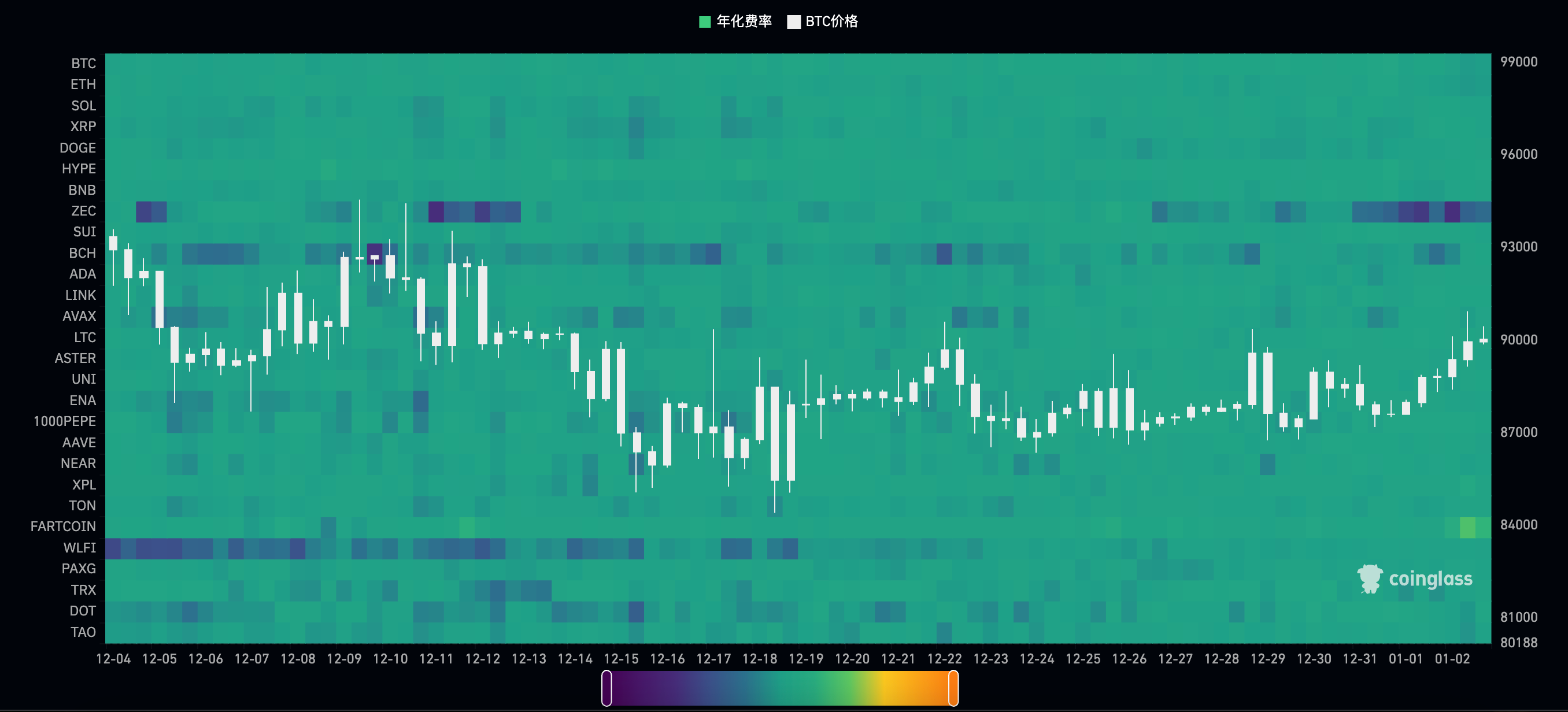 a. 周末市场小幅上涨,恐慌指数从上周的恐慌情绪迅速拉升至接近中性,表明市场对新年的开始抱有较为看多的态度,但当前仍坐落于恐慌区间,币价反弹力度也有限,市场仍未形成反转。