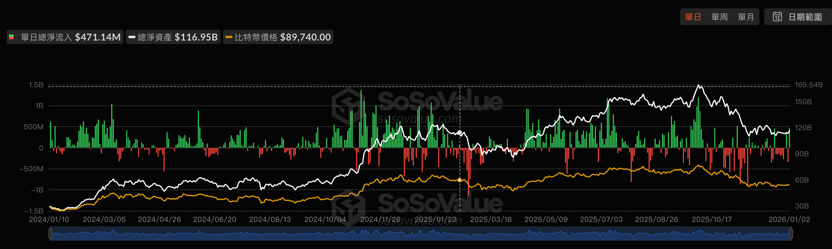 a. 进入 2026 年的第一个交易日,市场呈现了不错的流入势头,市场在 12/30 和 1/2 两日大额流入,分别流入 3.5 亿美元和 4.71 亿美元,本周市场讲十分重要,ETF 的流入状况代表机构在脱离 tax-harvesting 之后的第一周内对未来市场的预期,另外 Vanguard 在 12 月份的入场可能会是除贝莱德之外的另一大推动。