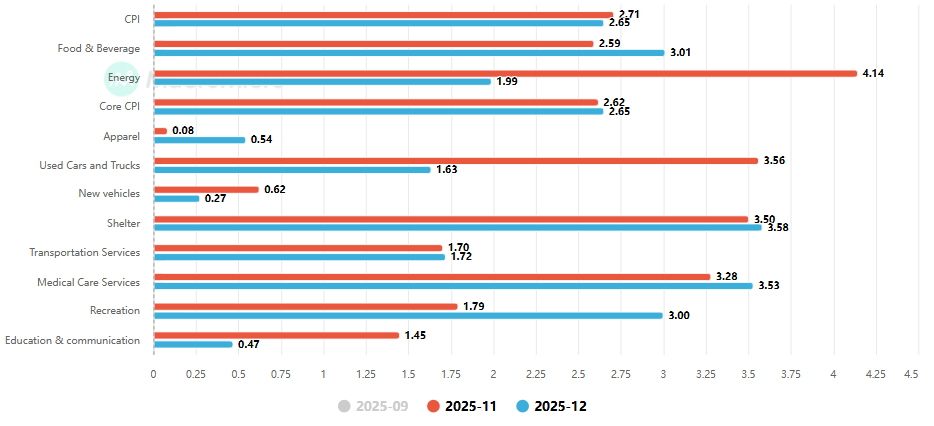 a. 12 月 CPI 同比增长 2.7%,持平预期及前值。同时,核心 CPI 同比增长 2.6%,持平于前值 + 低于预期的 2.7%。通胀下行速率明显放缓,服务类通胀压力尚未实质性缓解;