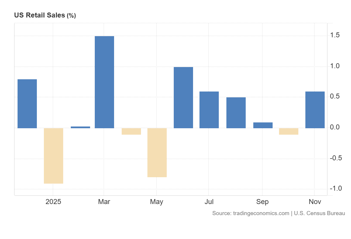 a. 美国 11 月零售销售环比增长 0.6%,高于预期的 0.4% 及下修后的前值 -0.1%,为 7 月以来最大增幅,主要源于强劲的节日购物季以及汽车销售的反弹。The rise was driven by a rebound in auto sales and strong holiday shopping. Biggest increases were seen in musical instrument, & book stores (1.9%), gasoline stations (1.4%); building and garden suppliers (1.3%); motor vehicle dealers (1%); clothing stores (0.9%); food services & drinking places (0.6%)