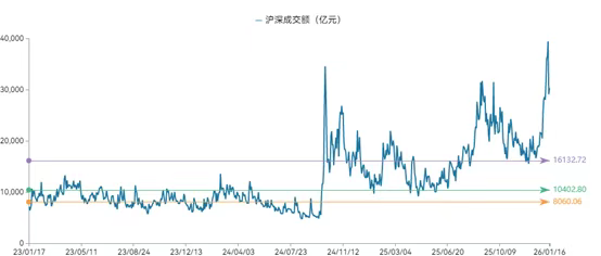 b. A 股成交额连续多日超 3 万亿并呈现“加速式放量”,日交易规模超过 2024 年 9 月底行情;