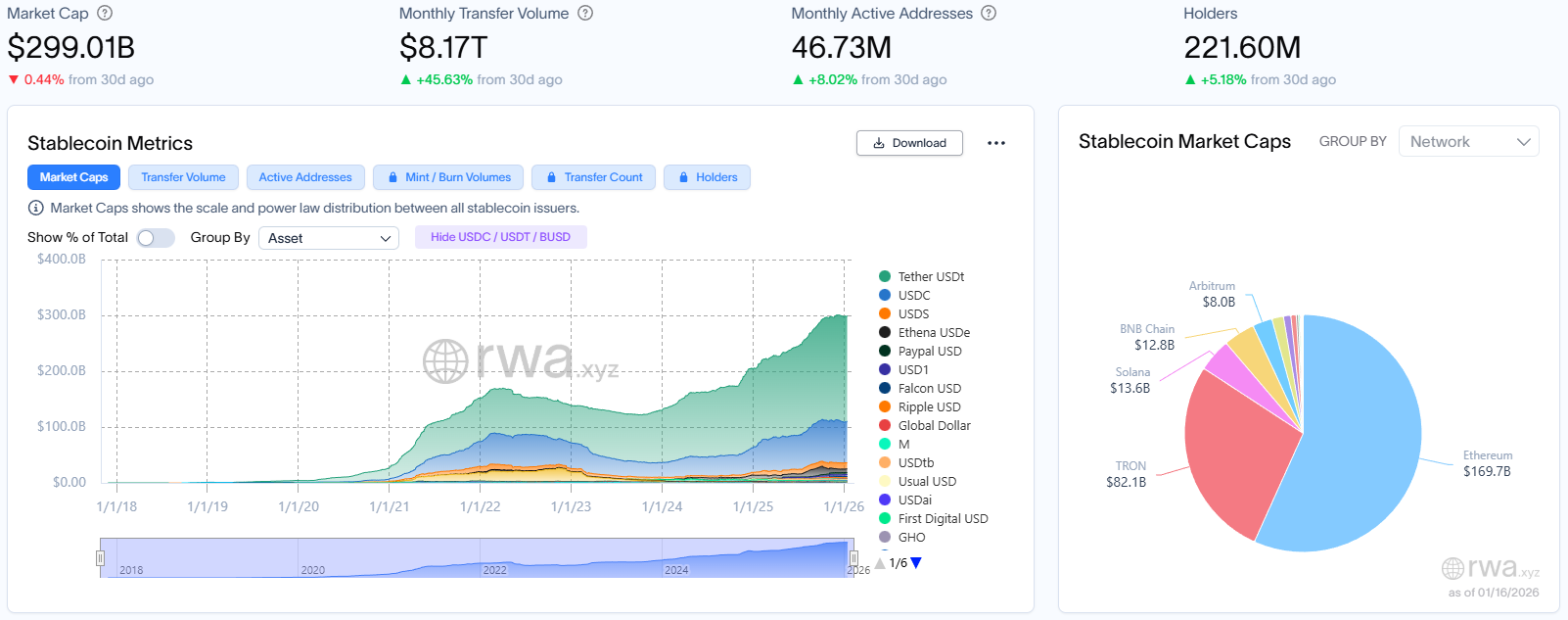 b. 资金流数据层面,稳定币总市值达 2,990.1 亿美元,环比上月同期微降 0.44%,整体规模连续收缩,但月度转账量飙升至 8.17 万亿美元,环比上月同期剧增 45.63%,周转率(转账量 / 市值)高达 27.3 倍,表明存量资金活跃度与使用效率剧烈提升,同时月活地址总数增至 4,673 万,环比上月同期上涨 8.02%;持有者总数稳步增至约 2.22 亿,环比上月同期增长 5.18%,用户基础持续拓宽,表明市场已进入 “存量博弈深化与结构性调整”阶段。