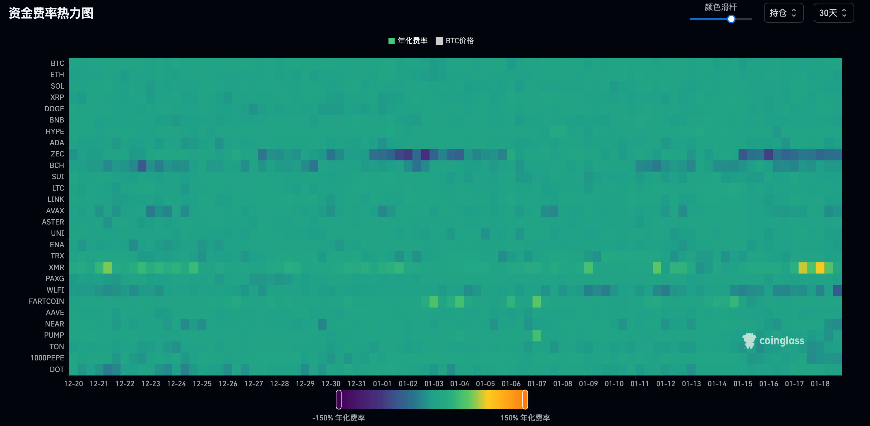 b. 上周资费有所回暖,热力图可以明显看到资费在从深度的负数区间向万一靠拢,山寨市场在逐渐回暖,另外进入 12 月以来,BTC Dominance 在逐渐降低,也表示资金在逐渐从持有 BTC 的防守动作开始流入山寨市场。