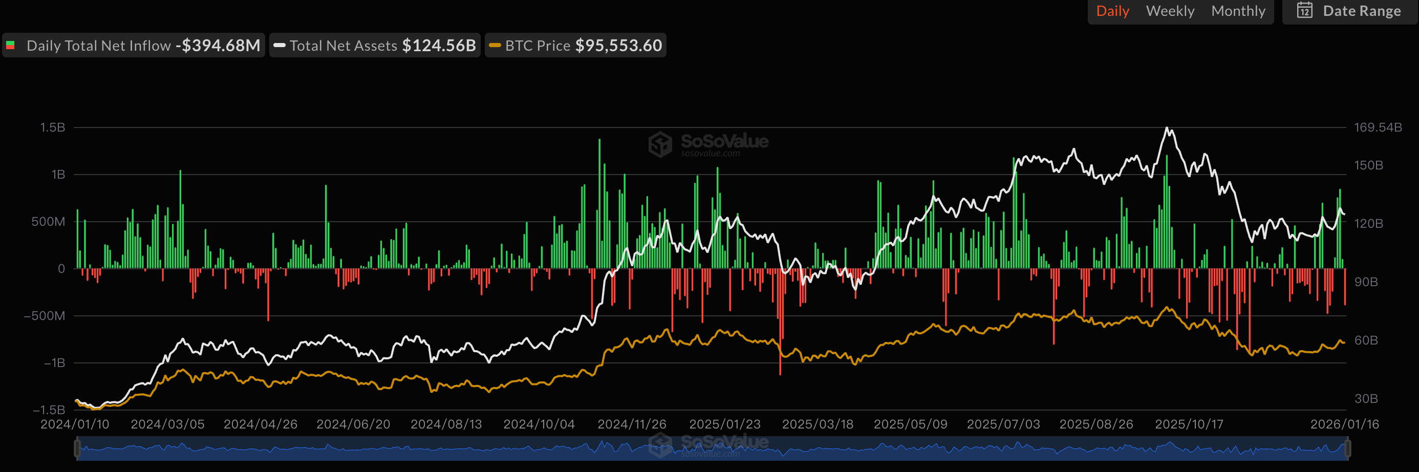 a. 上周币价上涨,比特币 ETF 的连续大额流入给市场上涨带来了极强的动力,本周比特币现货 ETF 净流入 14.20 亿美元,其中入最多的比特币现货 ETF 为贝莱德(BlackRock)ETF IBIT,周度净流入为 10.35 亿美元,目前 IBIT 历史总净流入达 634.40 亿美元。其次为富达(Fidelity)ETF FBTC,周度净流入为 1.94 亿美元,目前 FBTC 历史总净流入达 119.20 亿美元。