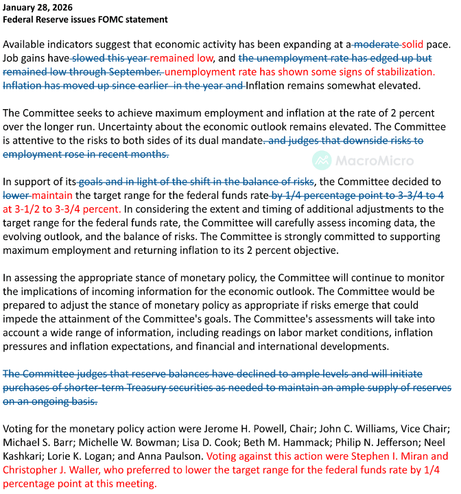2. 关于就业:将失业率描述从“edged up through September”调整为“shown some signs of stabilization”,显示劳动力市场并未如先前预期般快速降温;