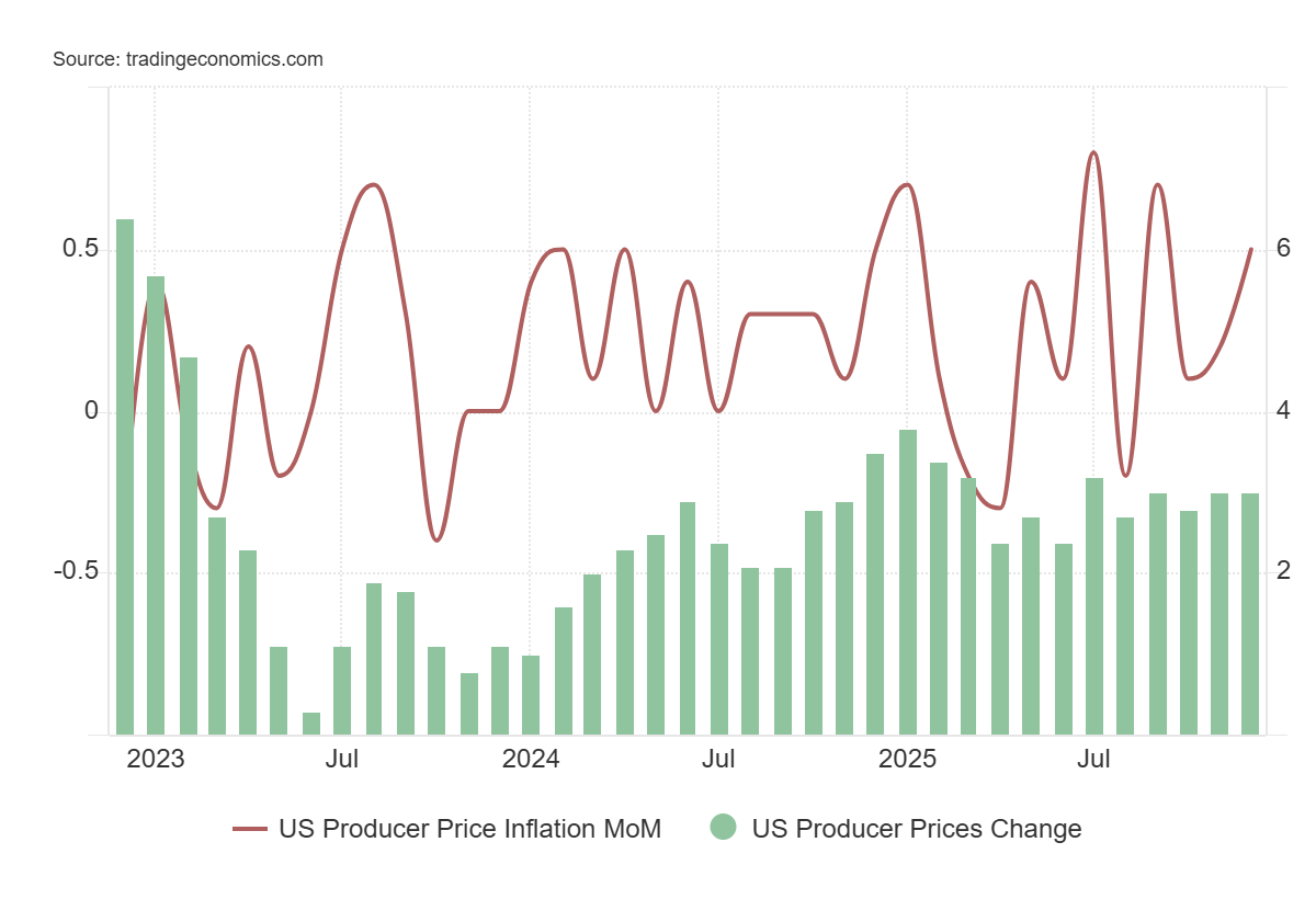 a. 12 月 PPI 同比上涨 3%,持平前值但高于市场预期 2.7%,环比上涨 0.5%,高于前值及市场预期的 0.2%,为近三个月最大涨幅。上游成本压力仍具韧性,企业正持续通过供应链传递成本压力,或将影响美联储后续的货币政策路径;