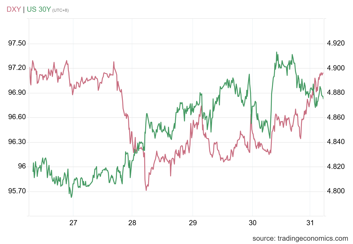 a. 市场提前定价“反对激进 QE”的立场,驱动美元与美债收益率从降息预期转向流动性收缩定价,美元与 30 年期长债收益率同步走高;