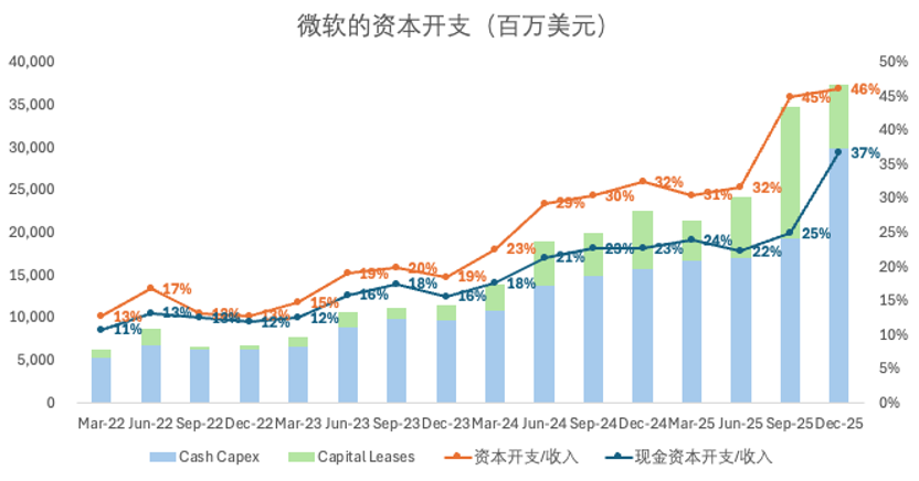 2. CapEx 激增引发回报忧虑 - 本季度资本性开支达到了 375 亿美元,同比增长 66%,高于市场预期的 362 亿。其中,Cash Capex 环比大幅提升 105 亿,达到 299 亿美元,微软正在烧钱部署算力;