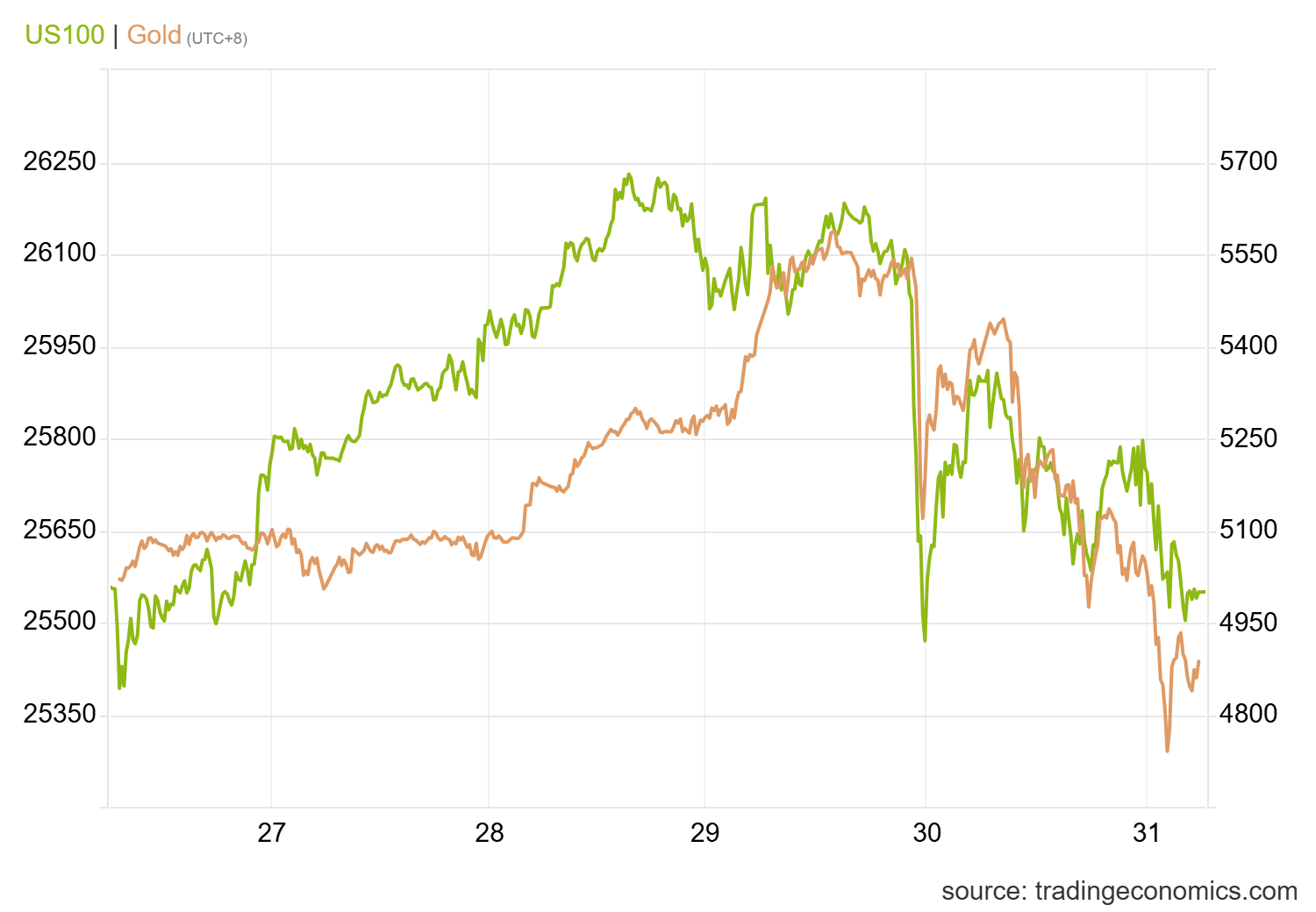 a. 1 月 29 日创下 $5,598/ 盎司 的历史新高后,“政策利空点火 + 期权对冲自燃” 的联合绞杀于 30 日爆发“跳水”行情,盘中一度跌穿 $4,700 关口,单日 9.25% 的跌幅不仅抹平了月内涨幅,创下 2013 年以来的最大单日跌幅;