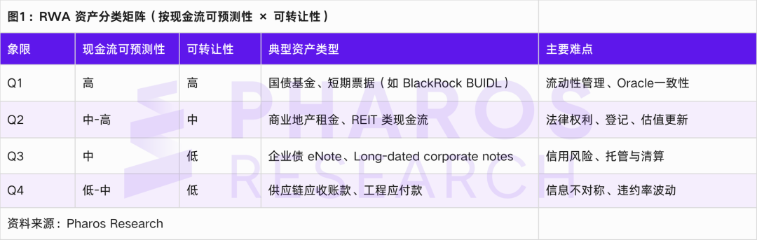 RWA 的估值、风险建模与流动性安排高度依赖现金流稳定性和权利可转让性,这里给出本文采用的双维度分类矩阵。