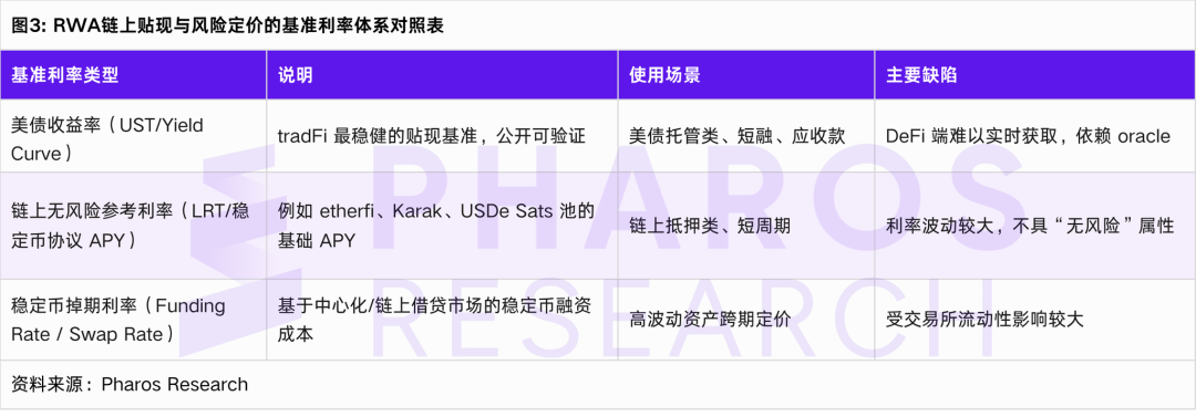 RWA 的折现框架应基于无风险或低风险曲线,但链上环境中并不存在完美替代。当前机构化设置中,可选择以下三类: