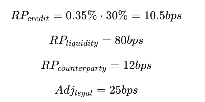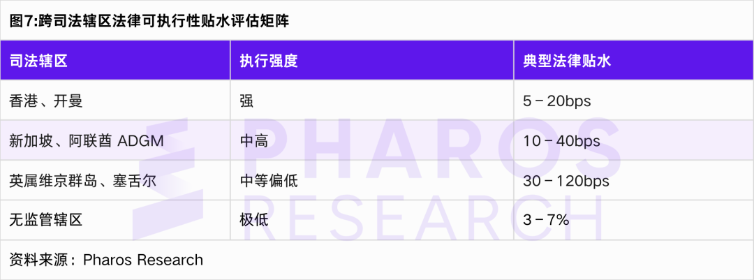 由于跨境执行、SPV 结构透明度不一、托管机构监管差异大,需设定法律贴水: